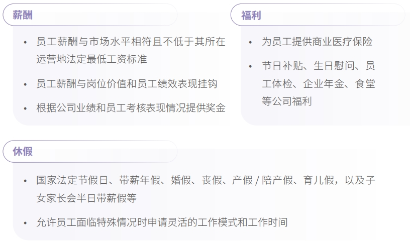 公司一直完善员工薪酬福利系统,以具有市场竞争力的薪酬水平吸引人才、激励人才,并按期开展组织效能剖析、薪酬市场对标事情,进一步优化薪酬政策或计划 ;为员工及其家人提供适当的生涯水平包管,并通过组织文体运动、帮扶难题员工、心理康健向导等切实提高员工职场幸福感。