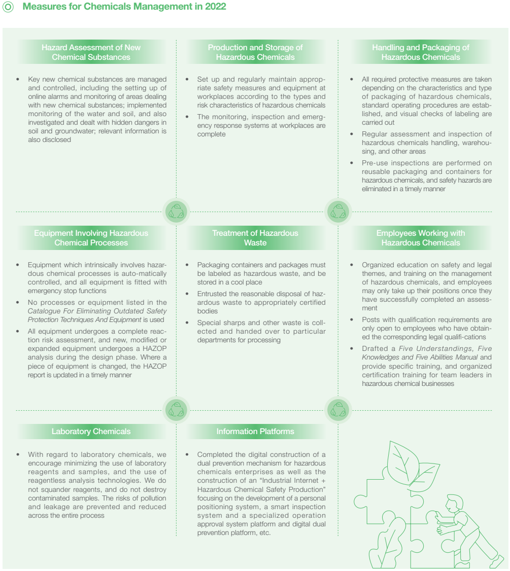 Based on the Hazardous Chemicals Procurement Management Evaluation Plan, the company also regularly conducts risk assessments with its hazardous chemical suppliers which cover core elements such as qualifications review, hazardous chemical transportation, etc. This ensures control and compliance when it comes to raw material procurement and the transportation of hazardous chemicals.